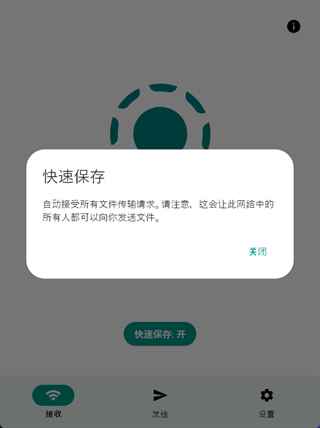 4、如果觉得每次接收文件都需要点同意比较麻烦,也可以开启快速保存功能,开启快速保存之后,客户端可以自动接收文件传输请求,但是这样一来,也会存在一定被他人骚扰的可能